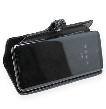 また、ムービーなどをご覧になる際は、端末をスマートフォンブック本体から斜めに立ち上げる事でスタンド形状でのご使用が可能なため、その際にわずらわしいと思われる本体フラップは、フラップの剣先に強度を持たせている事で、フラップの付け根にある小さなポケットに収納できるなど、実用的な機能も十分備えています。